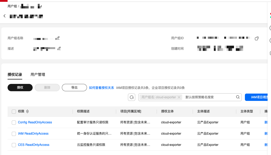 在启动cloud-exporter之前需要配置拉取云指标的IAM账号,打开https://console.huaweicloud.com/iam/创建子账号,并且授予下面这些权限即可正常拉取云指标